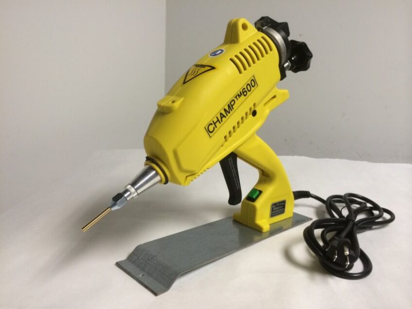 The Champ™ 600 Industrial Hot Melt Handgun, with 8 ounce melt tank, has a high output piston pump, The "No Drip" check valve nozzle tip virtually eliminates stringing. This tool also comes complete with adjustable temperature controls and a locking tank lid, for use with low cost bulk hot melt adhesives.