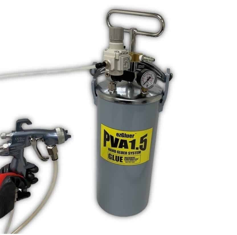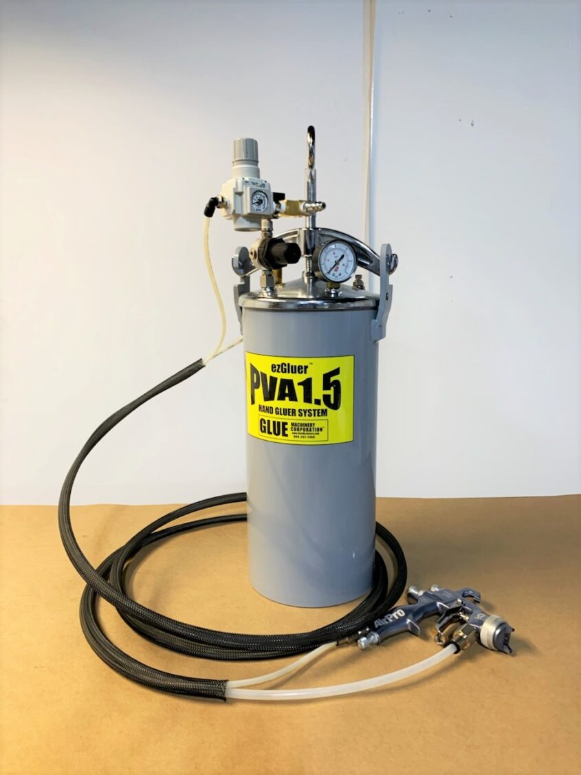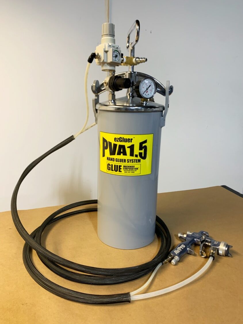 The ezGluer PVA 1.5 Spray Handgun System is used worldwide to spray low viscosity water based PVA glue with speed and accuracy. You will need to provide a female ¼ size industrial quick disconnect hose coupling to connect the compressed air. This equipment requires an estimated 10 scfm at a maximum of 72 psi. It is used intermittently provided it is kept full or continuously in 24/7 industrial environments.